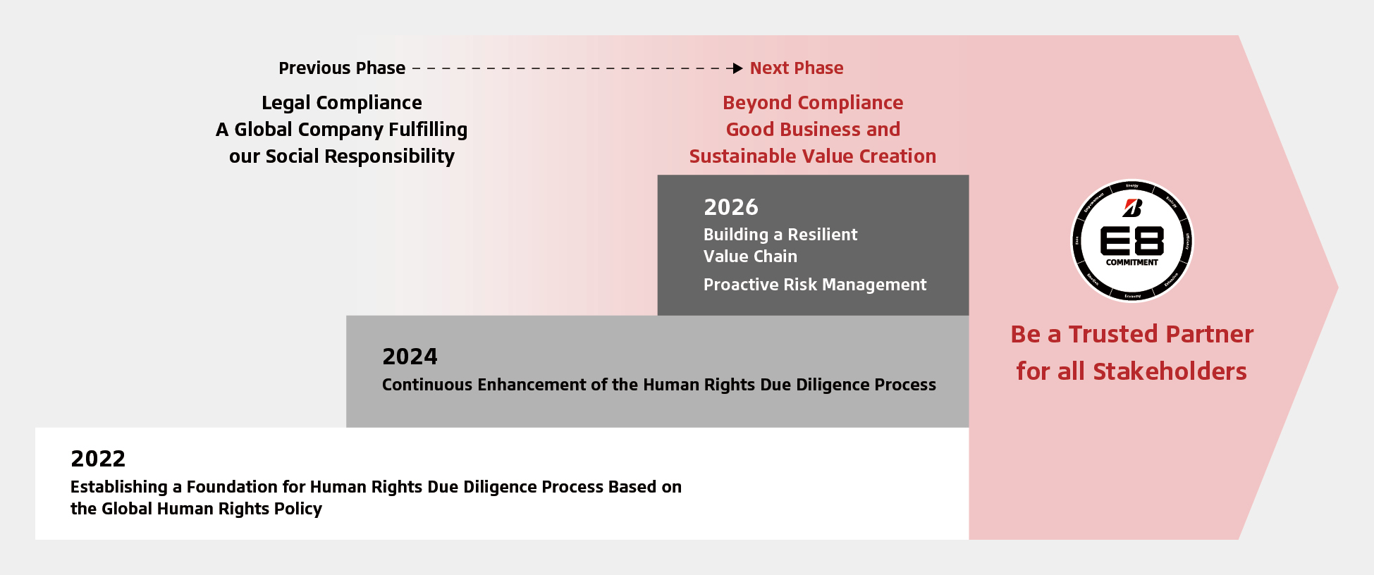 This mission is important to Bridgestone, as stakeholders and society increasingly hold businesses, and especially large global organizations, accountable for their specific human rights commitments and subsequent actions. Bridgestone proactively incorporates human rights initiatives into its business models and across its value chains, priorities, management policies, and business strategies. With these actions, Bridgestone is creating social and customer value and building trust with stakeholders.