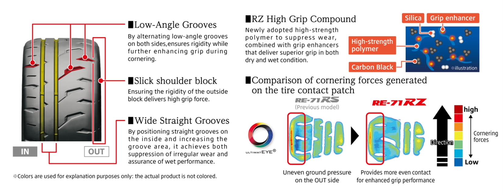 "As its strong point, "POTENZA RE-71RZ" achieves a high level of performance in both grip and controllability. It delivers improved dry and wet performance for street use, while also achieving faster lap times and better wear resistance on the circuit. This tire delivers high performance in various situations, making it enjoyable and easy to handle for both everyday driving and circuit use."