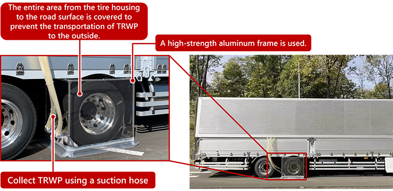 Bridgestone developed suction devices and inlets compatible with large tires. For the cover, a robust aluminum frame was adopted to be durable against strong wind. Using this collection device, Bridgestone can efficiently collect TRWP generated during driving.