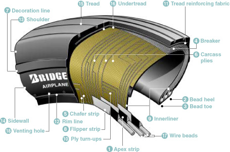 | 1. Apex strip: A triangular piece of stiff rubber which is fitted onto the bead core to taper the rigid bead into the flexible body plies in the sidewall. 2. Bead heel: Outer edge of the bead. 3. Bead toe: Inner edge of the bead. 4. Breaker: Breakers are fabric plies placed directly on the upper-most ply beneath the tread rubber. They disperse stress throughout the tire. This breaker is utilized in a limited number of Bridgestone aircraft tires. 5. Chafer strip: Reinforces the beads and protects the cord body-plies from damage from rim friction or from damage when replacing the rim. 6. Carcass plies: Each nylon ply is held by wire beads across the tire to keep the tensile strength at the proper level, and is folded to the side of the sidewall. Each ply is provided with cushion rubber to reduce shearing force produced between the cords of the tire when it is deformed. Multiple coated-nylon cords are crossed alternately on the bias to make the carcass. 7. Decoration line: A projecting, embossed line molded between the shoulder and sidewall of a tire. Its purpose is for decoration only. 8. Flipper strip: A strip of material which is wrapped around the bead bundle and filler to add support and help taper the assembly into the sidewall. 9. Innerliner: A sheet of special rubber laminated to the inside of the first casing ply of the tubeless tire so as to ensure retention of pressure when the tire is inflated. 10. Ply turn-ups: The turned-up ends of plies around the bead. Other plies lock the ends into place. 11. Tread reinforcing fabric: Nylon cord plies located in the tread between the tread groove and the outer ply of the carcass which reduce tread squirm and increase stability for high speed operations. 12. Rim line: This line is provided near the beads to allow inspection of how the tire fits with the rim. 13. Shoulder: The area on the side of the tire between the sidewall and the tread. 14. Sidewall: The side area of the tire located between the buttress and the beads. Composed of rubber, it protects the carcass from damage. 15. Tread: A layer of rubber on the outer circumference of a tire, its major functions are to protect the casing from cuts, withstand high speed during take-off and landing, provide traction, resist wear, provide durability under a wide range of temperatures and to ensure stability (in particular, the effective discharge of water on wet runways). The tread compound is designed to suit a wide range of operations. 16. Undertread: A rubber layer provided for use in retreading the tire and which provides adhesion of tread to the cord body. Bridgestone makes this rubber layer thick enough to ensure a high number of retreads. 17. Wire beads: Constructed of steel wire encased in rubber, they help to maintain the shape of the tire and keep it securely fixed to the rim. The wire beads are wrapped with fabric. 18. Venting hole: The hole through which gas is vented from inside the carcass plies. * Balance marker A balance marker, consisting of a red dot, is affixed on the sidewall of the tire immediately above the bead to indicate the lightweight point of the tire. > Basic Structure - Radial Tires |