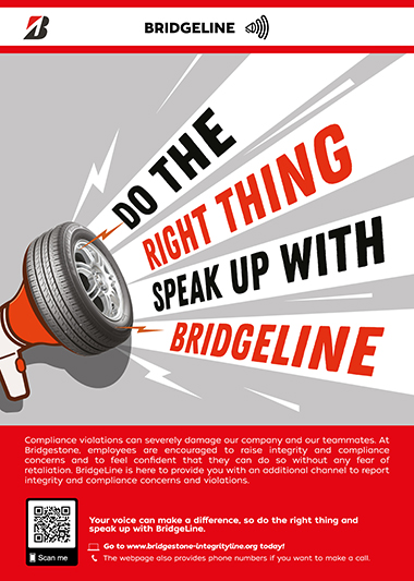 Bridgestone’s global ethics and compliance program consists of a blend of global and regional initiatives. It aims to balance global consistency with the flexibility needed to effectively address regional and even local risks that can vary significantly due to the wide range of operations Bridgestone is involved in and the variety of geographic, legal, and regulatory environments in which Bridgestone operates. Whether at the local, regional, or global level, initiatives are guided by Bridgestone’s core values and principles and are united under a common framework.